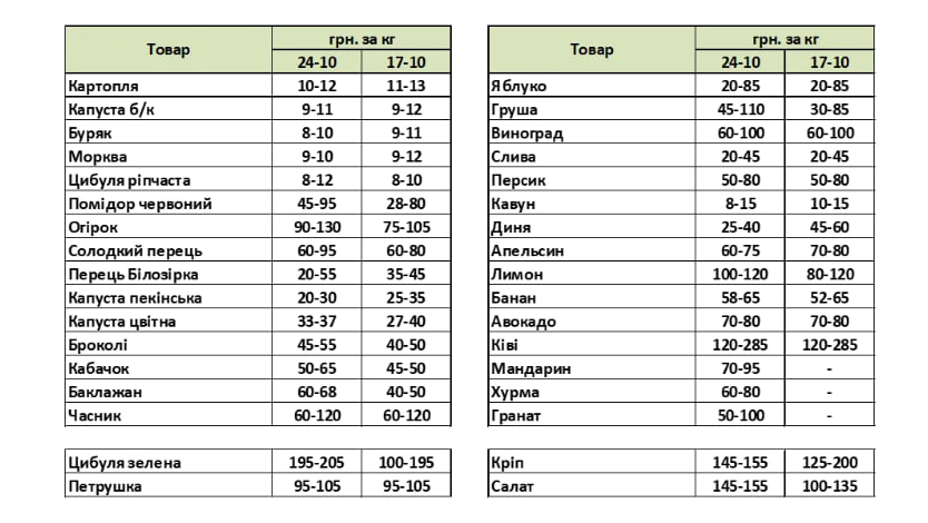 Найбільше зросли ціни на тепличні овочі. Тепличні помідори за тиждень подорожчали на 14% і станом на 23 жовтня коштували в середньому 80–90 грн/кг. Зростання пояснюють скороченням поставок із місцевих комбінатів через похолодання, яке сповільнило дозрівання культур.