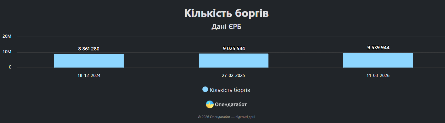Станом на початок березня 2026 року в Єдиному реєстрі боржників нараховується понад 9,5 млн записів. За останні 12 місяців їх кількість зросла на 514 360, що відповідає приросту приблизно на 6%. Водночас реєстр є динамічним – виконавчі провадження щоденно як відкриваються, так і закриваються. Про це повідомляє «Главком» з посиланням на дослідження «Опендатабот».