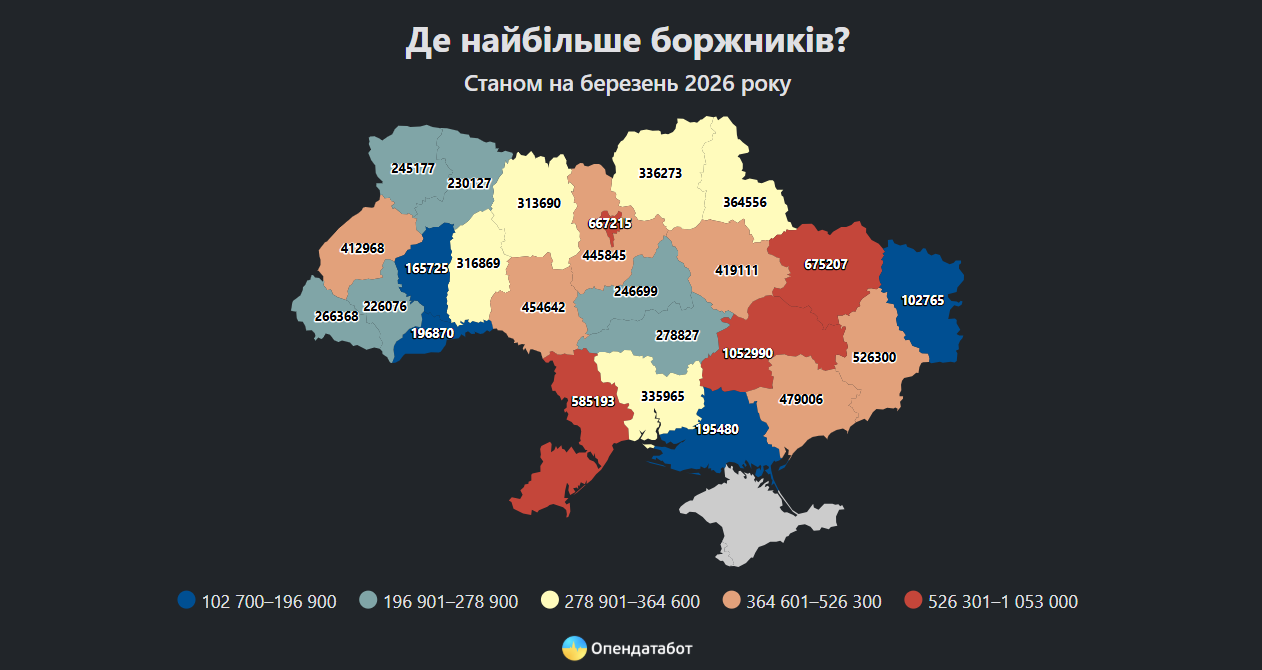 У регіональному розрізі найбільше боргів традиційно зосереджено у Дніпропетровській області – понад 1,05 млн проваджень (близько 11%). Далі йдуть Харківська область (675 тис., 7%), Київ (667 тис., 7%), Одеська (585 тис., 6%) та Донецька області (526 тис., 6%).