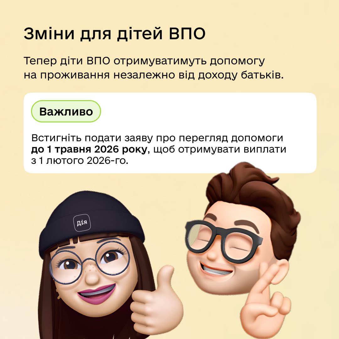 - допомога для дітей ВПО тепер призначається незалежно від рівня доходу родини – з 1 лютого 2026 року;