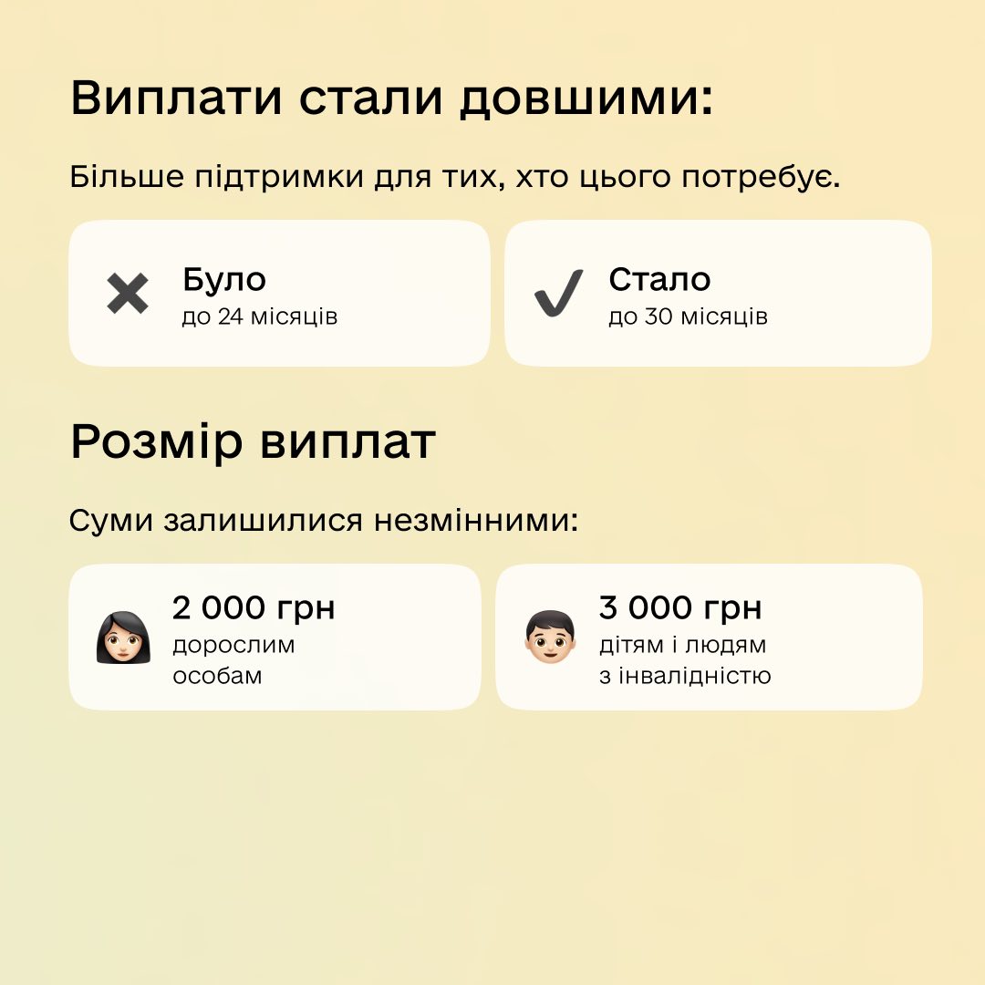 Окрема новація стосується людей, яким виплати раніше припинили через перевищення граничного доходу. Тепер вони можуть повторно звернутися за перерахунком. Граничний дохід у 2026 році становить 10 380 грн на одну людину. Якщо заяву подано до 1 травня – виплати нарахують з 1 січня 2026 року; якщо пізніше – лише від місяця звернення.