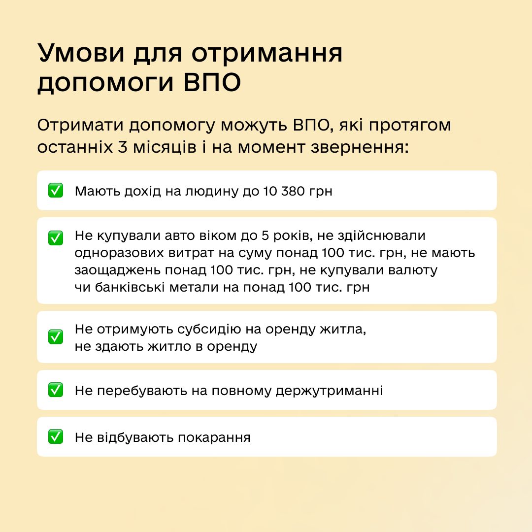Скористатися програмою можуть ВПО, які протягом останніх 3 місяців і на момент звернення відповідають таким критеріям: