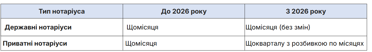 Державні нотаріуси, як і раніше, подаватимуть щомісячні звіти, тоді як приватні – переходять на квартальну звітність із деталізацією по місяцях. Хоча формально закон зменшує адміністративне навантаження для приватних нотаріусів, його головна мета – посилення контролю за операціями з нерухомістю та прозорість ринку.