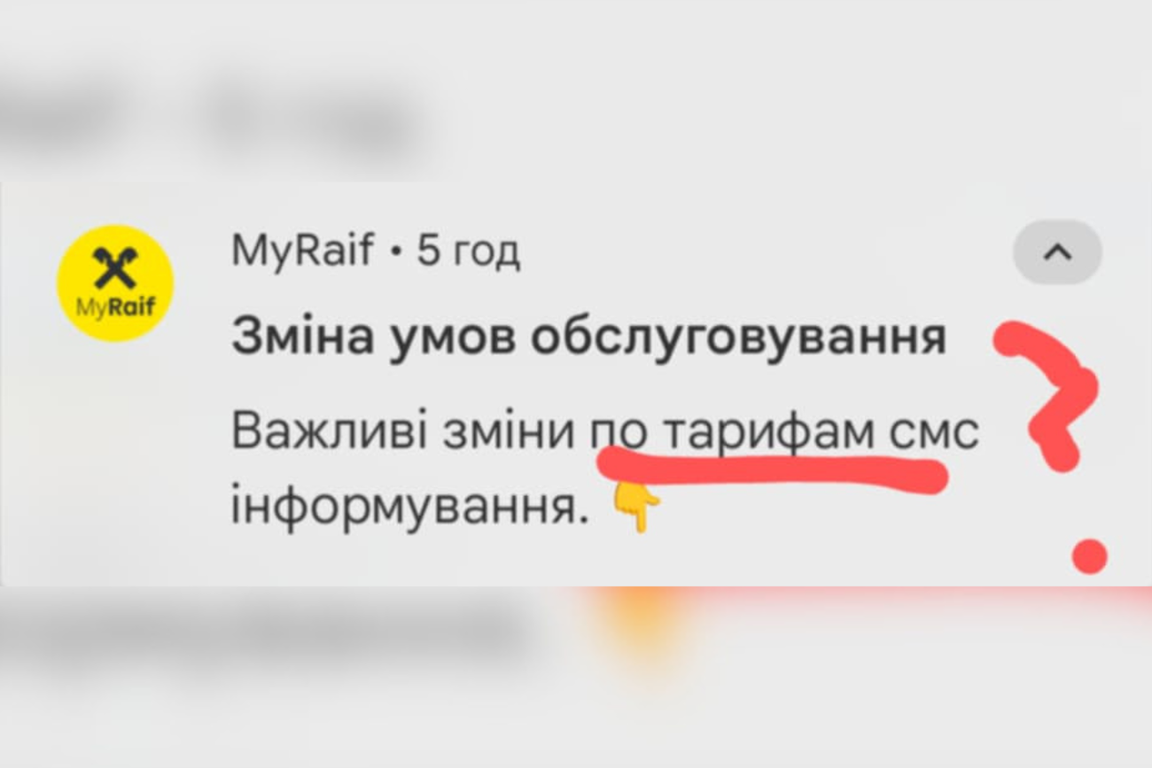Марія Олександрівна, Київ: Дуже часто отримую повідомлення від «Райффайзен Банку» з численними помилками. Пропоную порушити це питання публічно, адже на телефонні звернення ця фінансова установа вперто не реагує. Пані Ольго, підкажіть, будь ласка, як би банк мав грамотно повідомляти своїх клієнтів у випадку, що на скриншоті.