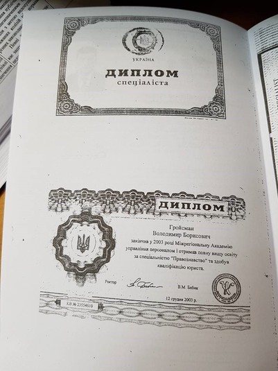 В біографії Гройсмана написано, що у 2002-2003 роках він отримав першу вищу освіту в МАУП, після школи, начебто заочно. Вказаний фах – «юриспруденція». Тобто він навіть не знає, як правильно називається спеціальність. Правильна назва – «правознавство».Я це знаю, бо сам так вчився три роки, тільки це була вже моя третя вища освіта. Я здивувався: чого це я там навчався три роки – на базі двох попередніх вищих освіт, а він – лише два? Це неможливо. Я подав запит у МАУП, але у виші мені відмовили у наданні інформації. Я зрозумів, що вони щось приховують. Тоді написав заяву тодішньому генпрокурору Віктору Шокіну, але він відмовив у відкритті провадження.