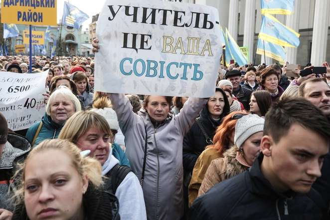 29 жовтня у Києві відбулася масова акція протесту освітян. За даними організаторів, до Києва з’їхалось близько 20 тисяч вчителів. Вони зібрались під Верховною Радою з гаслами «Гідну зарплату» і «Ні безглуздим реформам в освіті». «Безглуздими» працівники галузі називають запропоновані зміни до законопроєкту «Про повну загально-середню освіту» (№ 0901). Цей документ був ухвалений у першому читанні ще за часів попередньої влади. Нова ж хоче тепер його удосконалити.