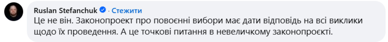 До нардепки в коментарі прийшов Стефанчук, який запевнив, що оприлюднений проєкт не має стосунку до «мегапроєкту», який має дати відповіді на всі виклики щодо проведення повоєнних виборів.