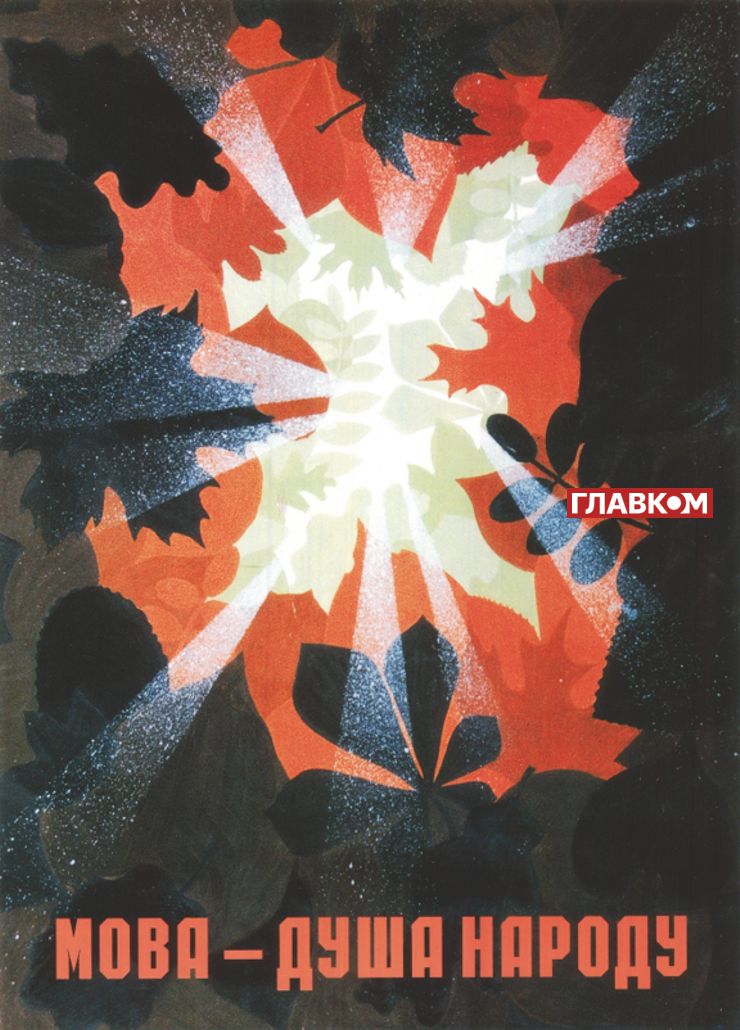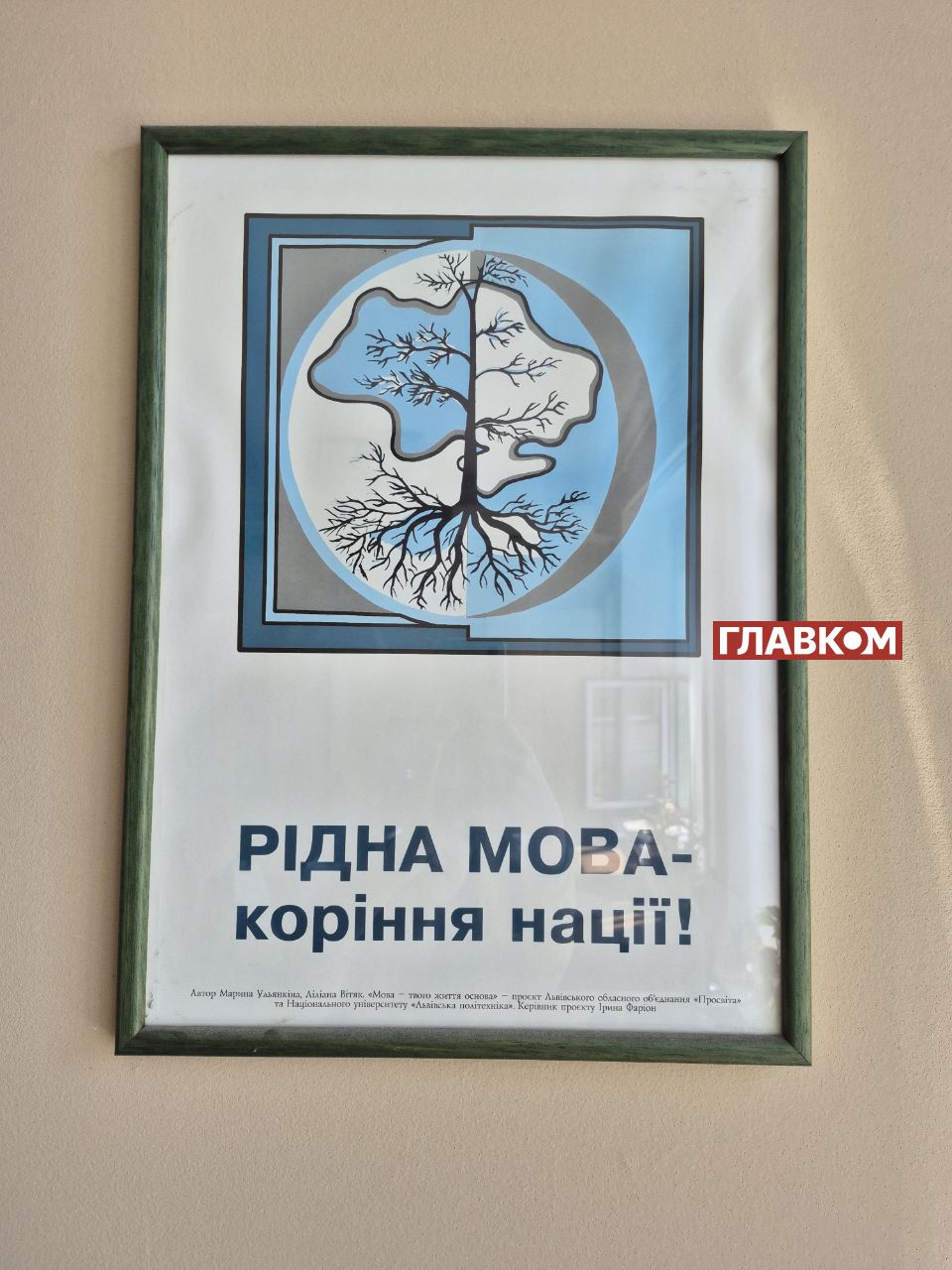 «Ось плакат «Рідна мова – коріння нації». Можливо, він має простий вигляд, але фахівці, тобто люди, які працюють з малюнком, його оцінили дуже позитивно, оскільки є коло як символ досконалости, є карта України, а карту огортає дерево, корінь якого веде в глибину тисячоліть. Це все узагальнює назва: «Рідна мова – це коріння нації», – веде далі мовознавиця.