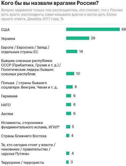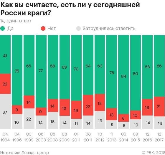 Наприкінці грудня впливовий незалежний російський соціологічний «Левада-центр» опублікував результати досліджень очікувань росіян від 2018-го року. Понад 80% країни-агресора вважають, що скоро їхнє життя нарешті покращиться, вони очікують на позитивні зміни. Ще 35% очікують на масові протести. Попри невдоволення нинішнім рівнем життя люди сподіваються, що бажані зміни їм має забезпечити… Путін. Тобто жодної інтриги перед березневими виборами президента не залишається. Третина росіян вважають Україну своїм головним ворогом. З нами у списку ще США і НАТО.