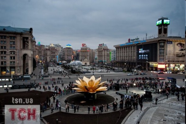 Гигантскую золотую скульптуру на Майдане Незалежности установили накануне открытия выставки современного искусства. На Майдане Незалежности состоялась презентация гигантского золотого лотоса, который специально для Киева создал известный корейский художник и дизайнер Чой Джонг Хва. 10-метровую скульптуру "Золотой Лотос" с Майдана планируют перевезти в "Мистецький Арсенал", где в этом году пройдет Первая киевская международная биеннале современного искусства ARSENALE 2012.