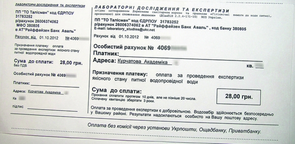 В «Киевводоканале» говорят, что к ним уже обратилось много киевлян, которые сообщили, что им пришли подобные квитанции. Больше всего звонков с Лесного массива. «Наша компания к этому никакого отношения не имеет. Экспертизу может проводить только сертифицированная лаборатория. Таких в Киеве — единицы, — объяснила нам советник главы правления «Киевводоканала» Виктория Яковлева. — Даже простой отбор проб проходит по определенной методике. Нельзя просто открыть кран, набрать оттуда воды и провести исследование. Второй момент — за 28 гривен нельзя провести такую экспертизу. Минимальная цена за анализ качества воды, который проводит лаборатория СЭС, стоит от 400 грн. Мы считаем, что это нечестная схема. Мы проверили компанию, указанную в квитанции по нашей службе безопасности. У них нет ни сайта, ни контактных номеров, никакой информации. Поэтому можно сделать вывод, что компания «с душком».