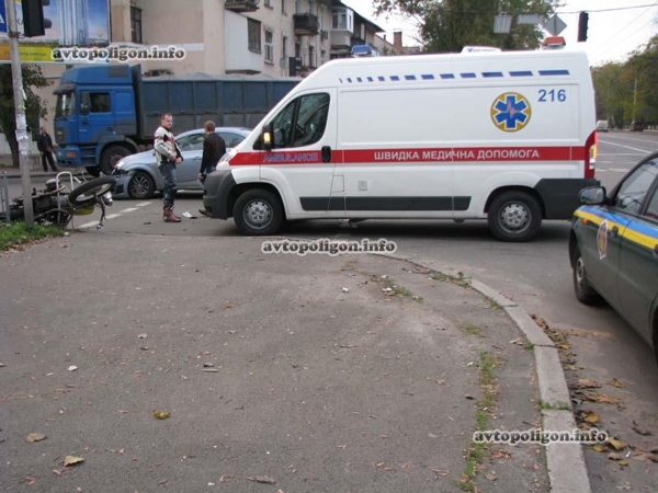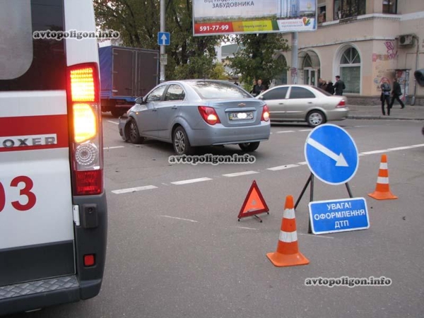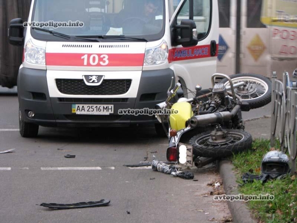 ДТП произошло 19.10.12 вечером, в г. Киев на пересечении улицы Строителей с бульваром Верховного Совета. Предварительно установлено, что мотоциклист на «Днепре» двигался по улице Строителей от улицы Попудренко, а автомобилист на «Chevrolet Aveo» по бульвару от проспекта Гагарина в сторону Тампере. По словам водителя «Шевроле», якобы именно мотоциклист выехал на запрещающий сигнал светофора, а водитель на «зеленый».