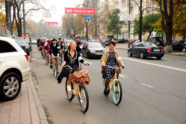 В субботу, 20 октября, в Киеве состоялся очередной – на этот раз, осенний – ретро-круиз на велосипедах. Стартовав от музея ВОВ на Печерских холмах, велобайкеры в старинных нарядах проехались через Липки, Крещатик и ул. Владимирскую на Михайловскую площадь, а оттуда, по маршруту «Большая Житомирская – Артема – Мельникова», до парка «Бабий Яр». Финиш участники акции отметили – в лучших английских традициях – торжественным чаепитием.