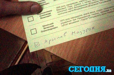 Киевляне голосуют за Ярослава Мазурка как кандидата в народные депутаты. Они дописывают фамилию подозреваемого в убийстве в ТРЦ «Караван» в бюллетень.