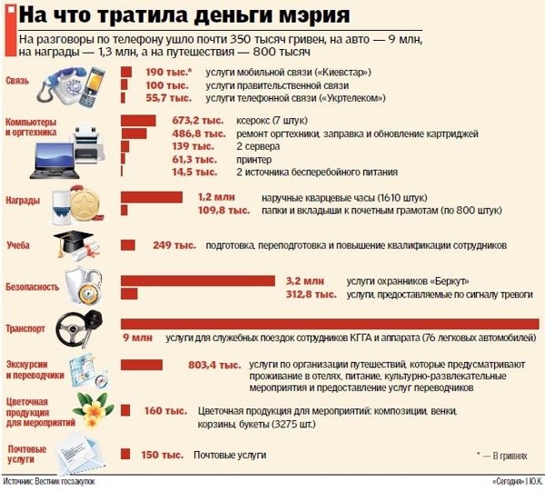 Стали больше денег тратить и на авто. Если в прошлом году закупались транспортные услуги на 5,6 млн грн, то в этом году — на 9 млн. Правда, тогда использовалось 23 арендованных машины, а сейчас 76. В мэрии говорят, что больше машин понадобилось из-за поездок по городу, но зато теперь внимательно следят за тем, кто и куда ездит, поэтому бензина тратят меньше.