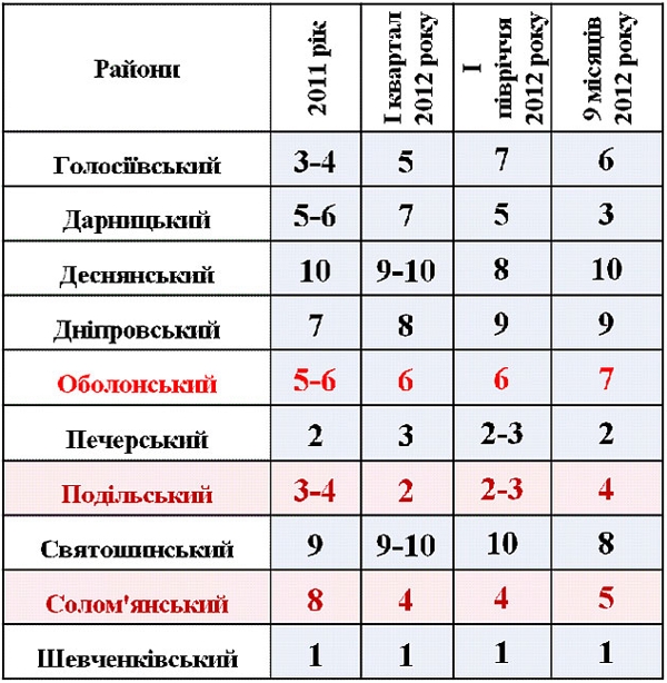 «Худшими в этот раз стали Днепровский и Деснянский районы, занявшие последние 9-е и 10-е место, соответственно. Анализируя работу Днепровского района, складывается впечатление, что такая ситуация удовлетворяет его руководство, ведь работы администрации не видно совсем. В Деснянском районе эйфория от полученного за I полугодие 2012 года 8-го места в определенной степени негативно повлияла на работу района в III квартале, что и вернуло его на 10-е место. В районе есть и положительные результаты, а именно: первое место в сфере социального развития и рынка труда. Однако из восьми направлений деятельности в рейтинге ухудшаются результаты работы в пяти», - отметил Руслан Крамаренко.