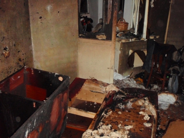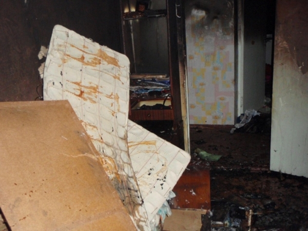В результате пожара огонь повредил диван, оконную раму, личные вещи, закоптив стены и потолок пятикомнатные квартиры.