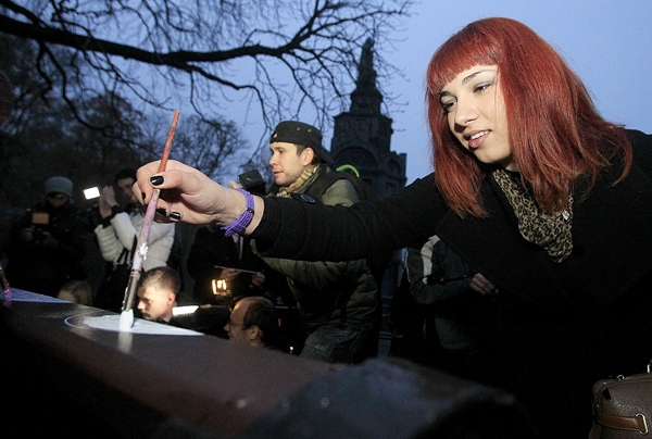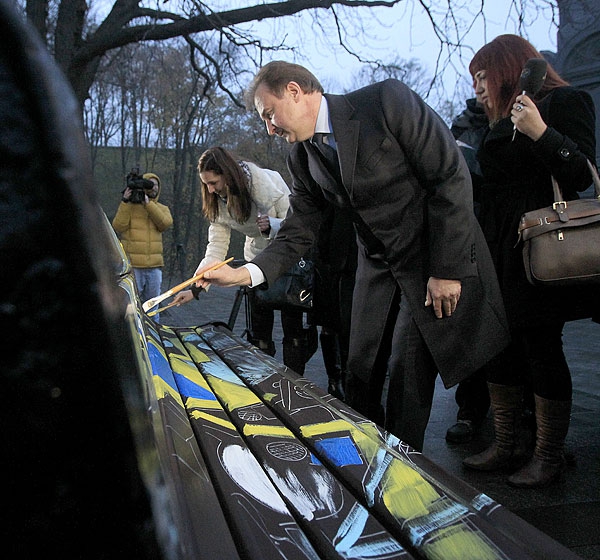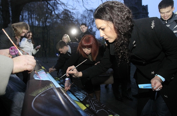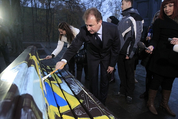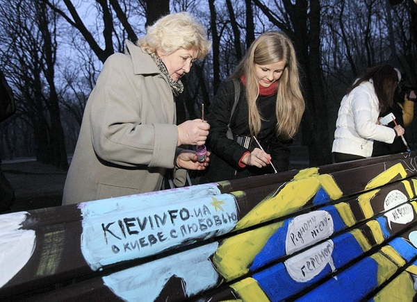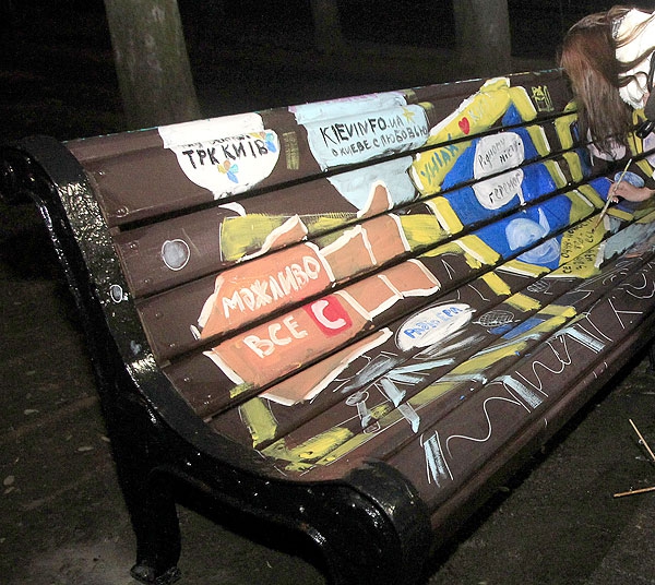 Разрисовать лавочку журналистам и председателю КГГА помогал молодой киевский художник Денис Дрейман, член общественной организации «URBAN-X». Именно он ранее уже расписывал стены и опоры при строительстве детского сада в Соломенском районе столицы.