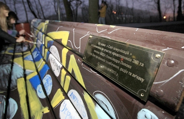 Разрисованная руками журналистов ведущих украинских СМИ лавочка «Мир коммуникаций» установлена в парке на Владимирской горке, рядом с памятником князю Владимиру, сообщает пресс-служба КГГА.