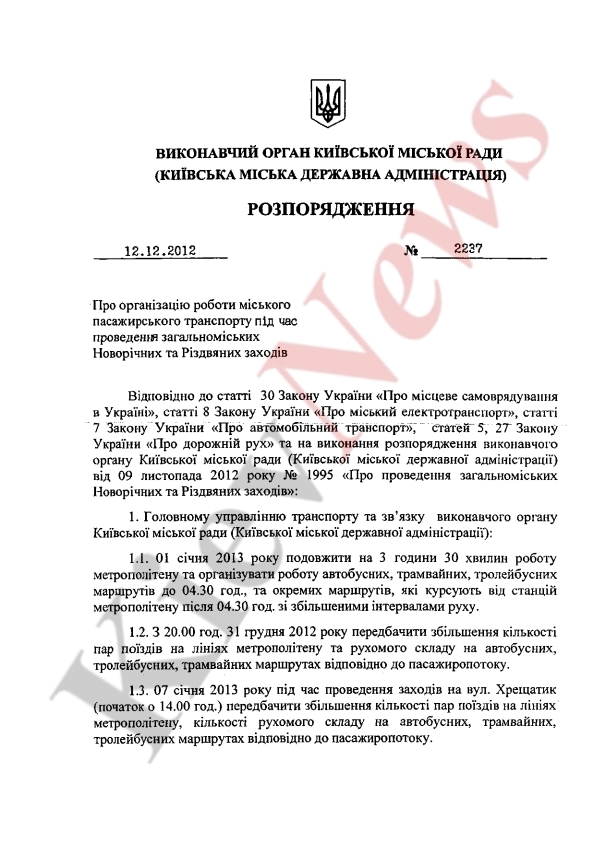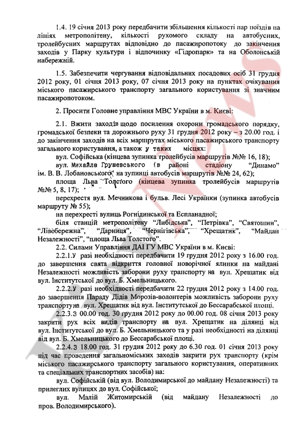 В период новогодних и рождественских праздников, с 30 декабря 2012 года по 8 января 2013 года, улица Крещатик на участке от улицы Институтской до улицы Богдана Хмельницкого, а при необходимости и до Бессарабской площади, будет перекрыта для движения всех видов транспорта.