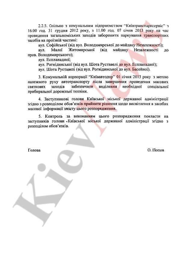 Водителям придется объезжать и такие улицы, как Софийская (от ул. Владимирской до Майдана Незалежности) и Малая Житомирская (от Майдана Независимости до пер. Владимирского), где с 18:00 31 декабря 2012 года до 6:30 1 января 2013 года будет запрещено движение всего транспорта, кроме общественного.