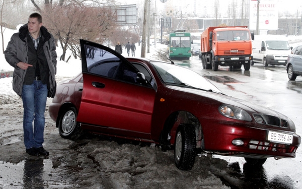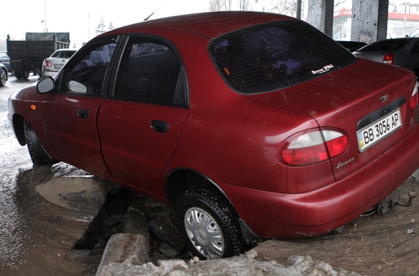 Пострадал участок под путепроводом недалеко от метро. «Я пытался припарковаться у обочины, когда под колесом стал проваливаться асфальт. Сам выехать уже не смог, - рассказал нам хозяин «Ланоса» Владислав. В западне он просидел больше двух часов, сначала позвонил в «Киевавтодор», потом в другие службы, чтобы вытащили его из ямы.