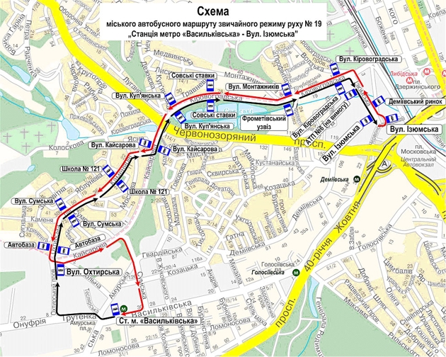 Движение автобусов будет организовано от станции метро «Васильковская» до ул. Изюмской по следующей схеме:
