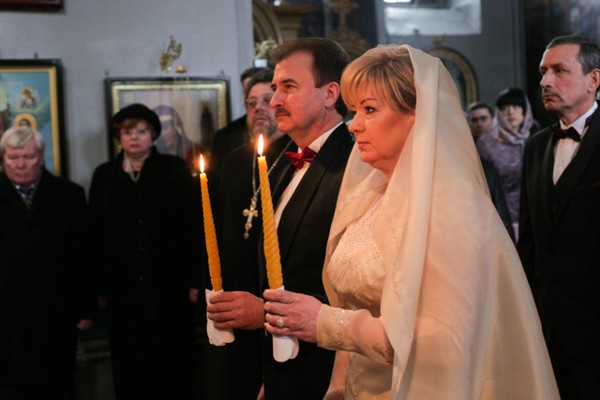 Идея венчания принадлежит самому Александру Попову. И дата, 1 февраля, выбрана потому, что ровно 28 лет назад именно в этот день они подали заявление в загс. «Это папа предложил маме обвенчаться. Я за них очень рада, думаю, это уже навечно, я желаю им счастья», — с волнением сказала нам 19-летняя дочка Ольга Попова. На венчание приехали и 27-летний сын Дмитрий с невесткой. Были и коллеги: первый замглавы Александр Мазурчак с женой, секретарь Киеврады Галина Герега приехала в белой норковой шубке. Они поскромничали, сообщив, что подарков дарить не будут. А глава Шевченковского района Сергей Зимин пришел с букетом белых роз. Молодожены вместе выбрали себе новенькие колечки из белого золота с узором. «Я не волновался, но сейчас думаю, что еще больше полюбил Ирину», — улыбался Попов. А Ирина рассказала, что ночью почти не спала.