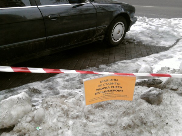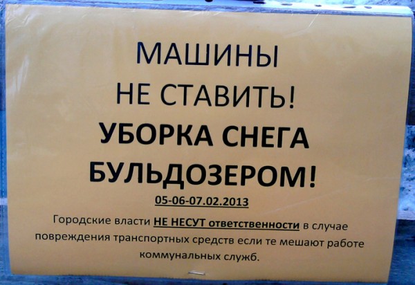Так, на ул. Красноармейская, 102, участок территории с собранным снегом обнесли красной лентой и повесили объявление следующего содержания: «Машины не ставить! Уборка снега бульдозером! 05-06-07.02.2013. Городская власть не несет ответственности в случае повреждения транспортных средств, если те мешают работе коммунальных служб».