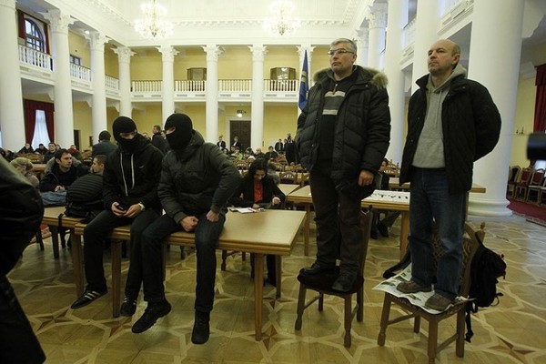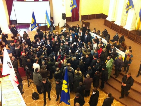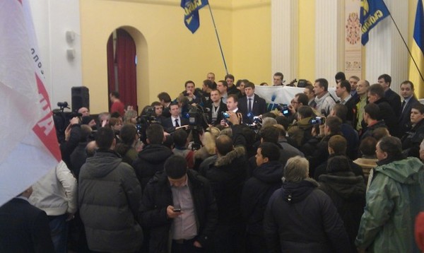 Сегодня утром столичные депутаты от оппозиции и несколько нардепов Верховной Рады не могли зайти в здание Киеврады. Как рассказали «ударовцы», путь преградила охрана, и чтобы зайти в помещение, депутаты трижды вызывали милицию. У центрального входа в это время собрались активисты - «свободовцы» и сторонники УДАРа. Через некоторое время депутаты все же зашли в мэрию, открыли протестующим дверь, и те ворвались в здание. В массовой потасовке пострадал начальник охраны: по словам главы депутатской фракции «Спортивный Киев» в Киевраде Виктора Гринюка, мужчину избил народный депутат Андрей Ильенко. Сам Ильенко это категорически опровергает.