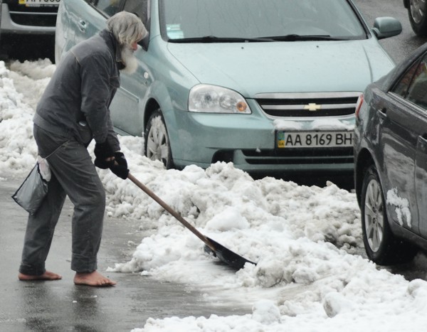 В Печерском районе Киева улицы убирает босоногий мужчина.