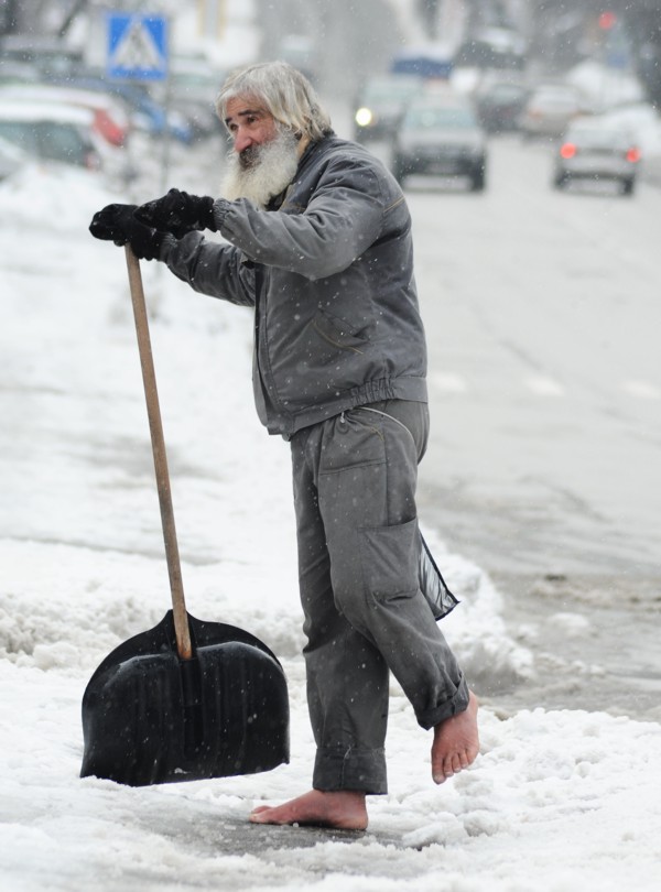 Он тщательно расчищает от снега тротуары и не обращает внимания на шокированных его видом прохожих. Является ли мужчина сотрудником коммунальных служб, не известно, поскольку говорить с журналистом он отказался.