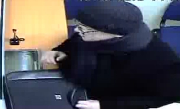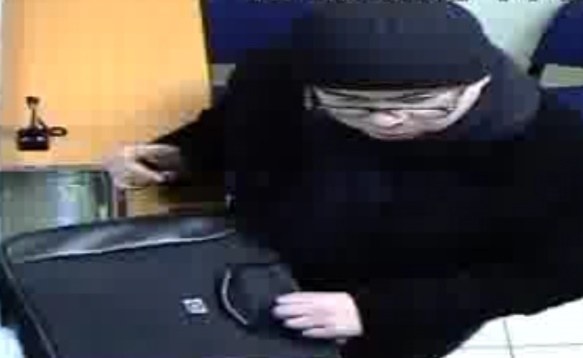На снимках с камеры видно, что мужчина выглядит на 35-40 лет, его рост около 175 см, имеет плотное телосложение. На момент ограбления он был в черной вязаной шапке и таком же шарфе, пальто темно-синего цвета, темные штаны. При себе имел черную сумку с логотипом «НР».