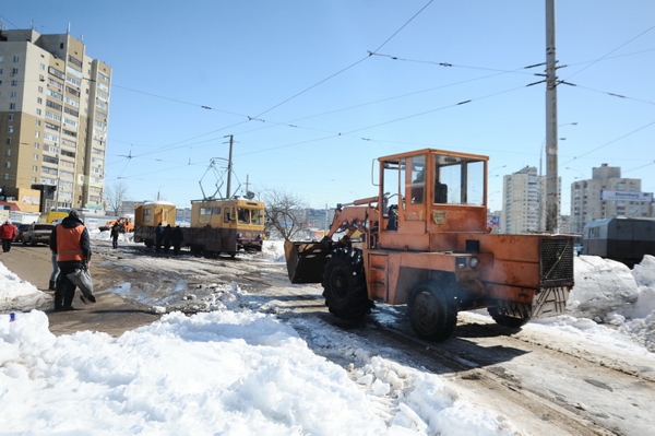 На месте, по ул. Героев Днепра (на разворотом кругу) работает около десятка рабочих в оранжевых жилетах с надписью «Пространство» вручную ломами колют лед, а вслед за ними остатки снега и кучки льда загребает технический трамвай со щеткой.