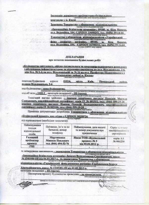 нспекция государственного архитектурно-строительного контроля в городе Киеве 21 марта 2013 года выдала ООО «Інноваційна Будівельна Компанія» и OOO «Український Фонд Розвитку Регіонів» Декларацию о начале строительных работ на объекте «Печерский бастион».