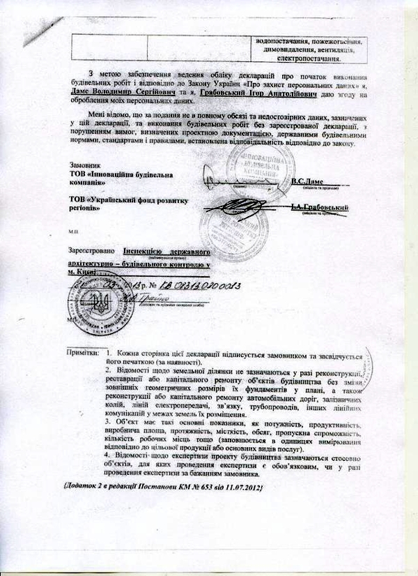 Разрешение ГАСК оформил на основании договоров об аренде земли, которые еще в прошлом году отменил Хозяйственный суд. Недействительность договоров подтвердил Апелляционный суд. Более того, это решение вошло в силу, и оно обязательно к исполнению. Получается, что ГАСК выдал Декларацию на основании недействительных документов, поданных застройщиком. Между тем, напоминаем, что за предоставление недостоверных данных для получения этой декларации, предусмотрена персональная ответственность согласно закону.