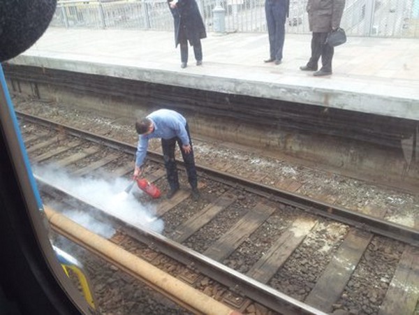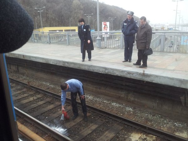12 апреля примерно в 12-40 на станции метро Днепр машинист электропоезда с огнетушителем под сочувствующим наблюдением милиционера, станционной дежурной и неопознанного человека тушил из огнетушителя задымление на рельсах.