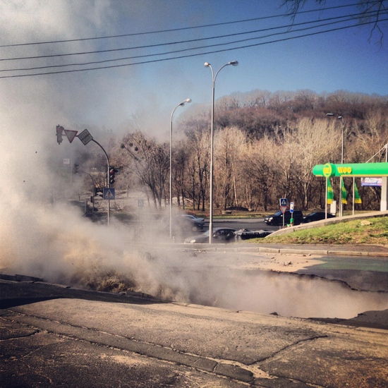 Как сообщает пресс-служба ПАО «Киевэнерго» во вторник, повреждение магистральной теплосети произошло утром 16 апреля на проезжей части, в результате чего провалился асфальт и кипяток начал вытекать на поверхность.