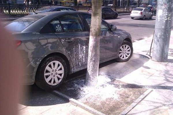 Коммунальщики белили дерево и, видать, решили отомстить водителю, который припарковал свое авто так близко к рабочему объекту.