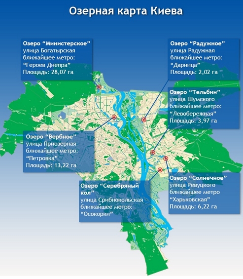 Первое озеро в нашем списке – «Тельбин». Оно известно тем, что имеет форму бумеранга. На его берегах находится две церкви и автостоянка. Есть также кабинки для переодевания. Озеро является одним из самых крупных в Киеве, его площадь – 3,97 га. Находится водоем на улице Шумского, ближайшая станция метро – «Левобережная».