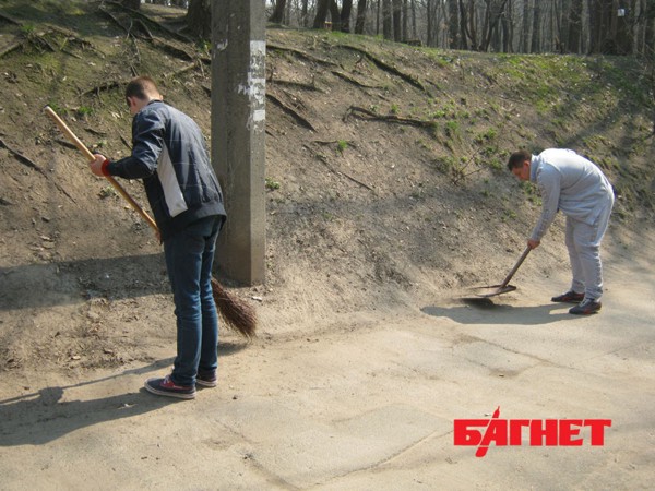В частности, уборка прошла и в Голосеевском парке. Несмотря не то, что сейчас в городе стоит очень теплая погода, в отдаленных уголках парка до сих пор остались кучи нерастаявшего снега. Так что вместе с мусором активистам пришлось убирать и его. Впрочем, столичные общественники умеют не только снег весной убирать, но и ямы на дорогах креативно ремонтировать.