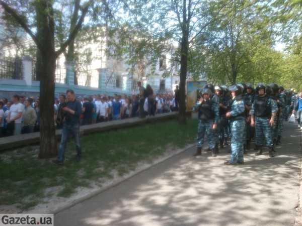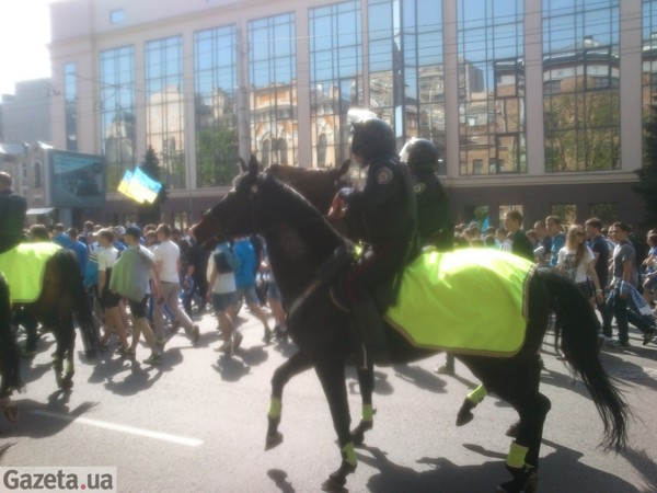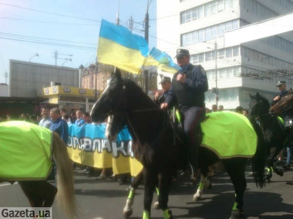 Несколько сотен «беркутовцев» и отделения конной милиции охраняли сегодня марш футбольных фанатов в центре Киева. Участники акции прошлись по маршруту от парка имени Т. Г. Шевченко к Предславинской, где расположено столичное управление прокуратуры.