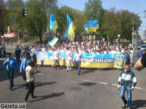 Фанаты собрались в 14:00 в парке и прошлись по улице Горького и Ивана Щорса в прокуратуру. Большинство из них - болельщики столичного «Динамо» и днепропетровского «Днепра». Сегодня на НСК «Олимпийский» проходит очередной тур чемпионата Украины между командами.