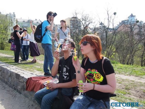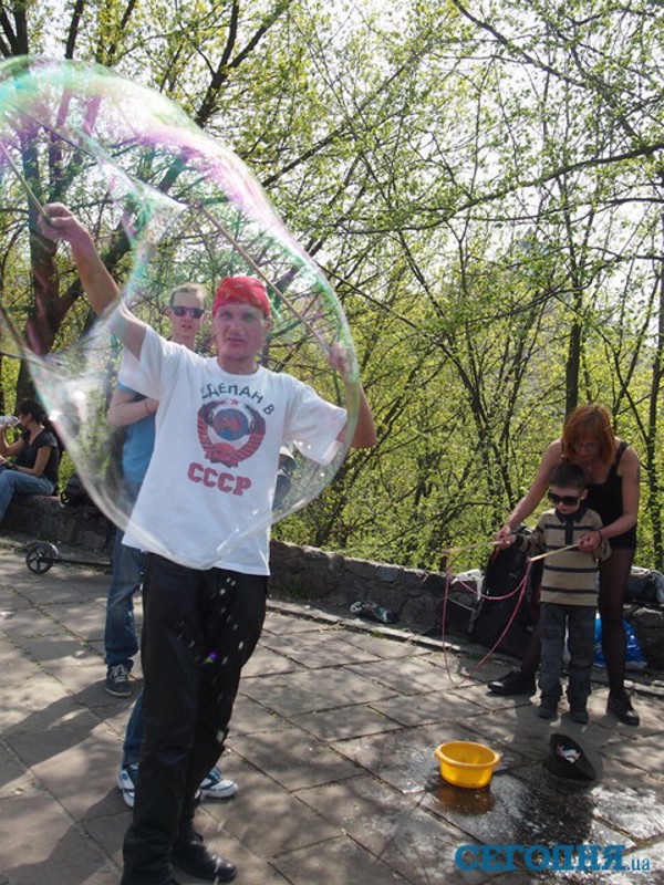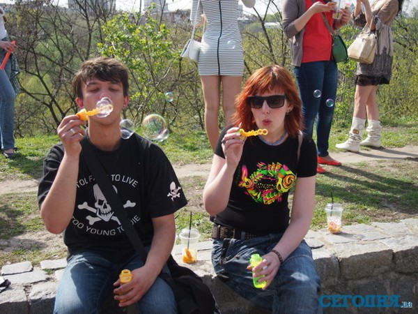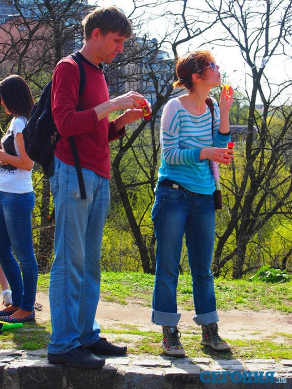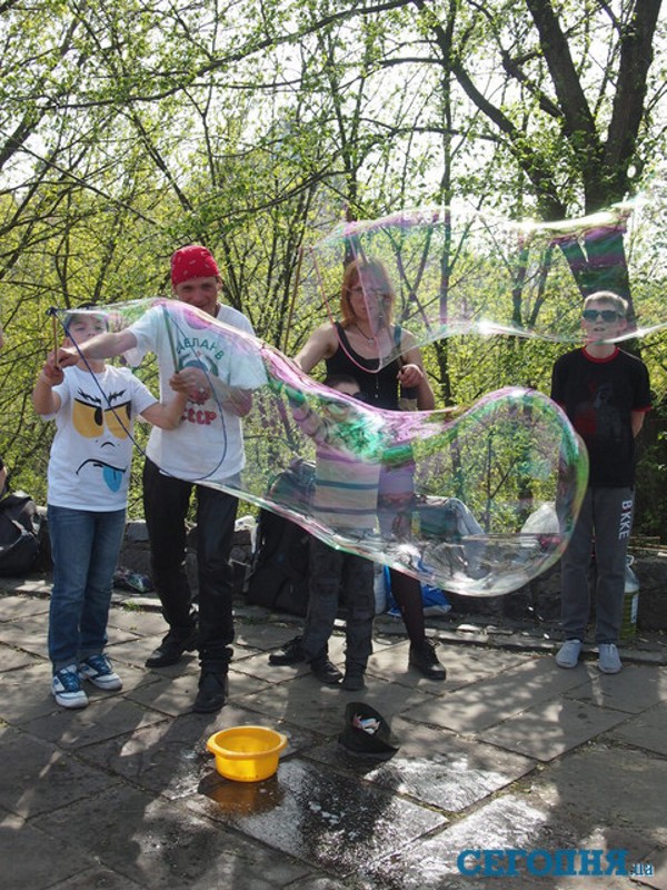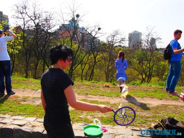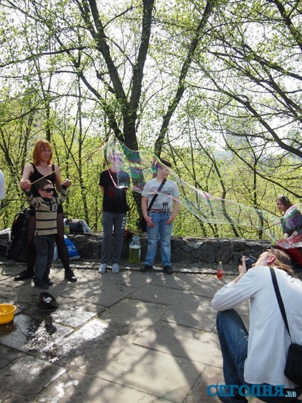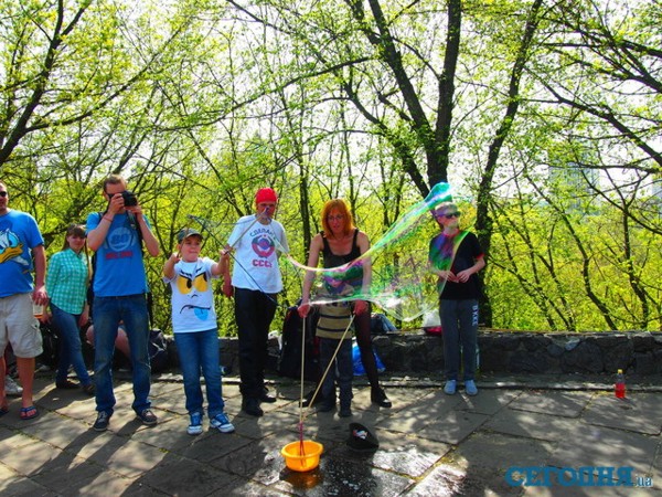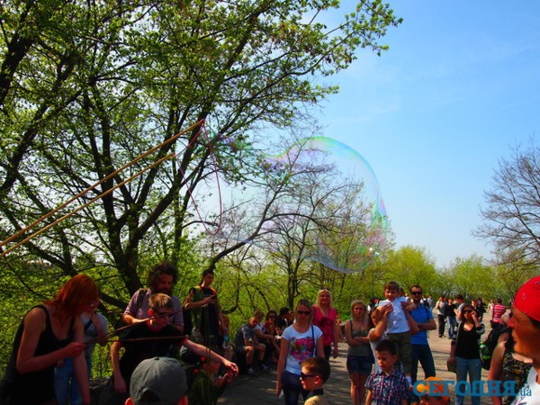 Сегодня на Пейзажной аллее в Киеве прошел Парад мыльных пузырей. Молодежь собралась, чтобы устроить массовое пускание пузырей, в том числе и гигантских.