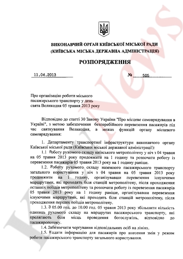 Кроме того, согласно распоряжению КГГА «Об организации работы городского пассажирского транспорта в день праздника Пасхи 5 мая 2013», 5 мая станции киевского метрополитена откроются для пассажиров на 1 час раньше.