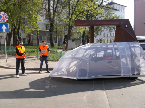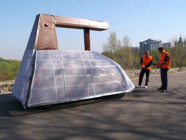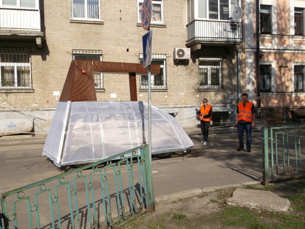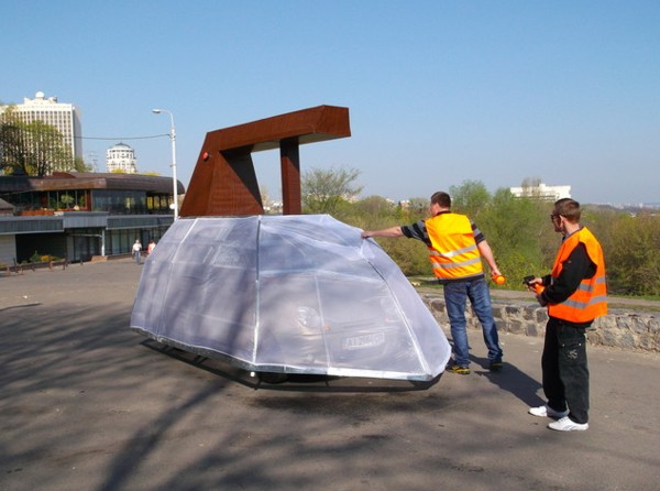 Ужасающее состояние столичных дорог сподвигло скульптора Константина Скритуцкого создать передвижной арт-объект под названием «Утюг» — символ бездействия «Укравтодора». Для этого он оборудовал свой автомобиль специальной накидкой и приделал к нему ручку коричневого цвета. «На этой машине мы планируем выезжать на проблемные участки дорог в Киеве, чтобы показать чиновникам, что наши дороги не ремонтируют, а всего лишь утюжат, выбрасывая на ветер миллионы. На днях мы уже проехались утюгом по Крещатику и Владимирской», — говорит скульптор.