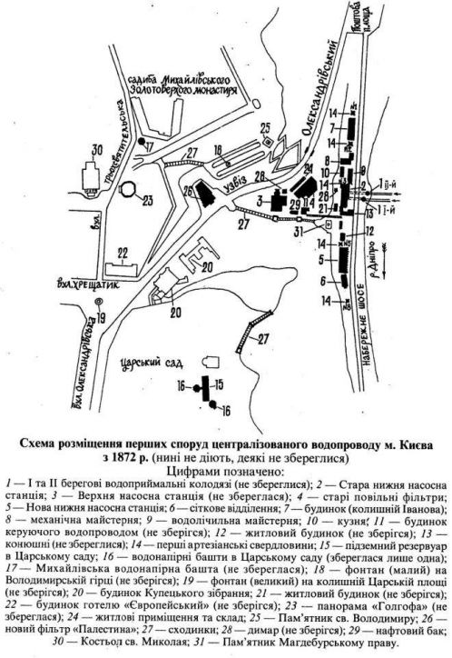 По трубопроводу вода поступала в резервуар у напорной башни в бывшем Городском саду, а оттуда подавалась в город. Сейчас это территория между Мариинским и Крещатым парками, а в помещении указанной башни сегодня размещается Водно-информационный центр.