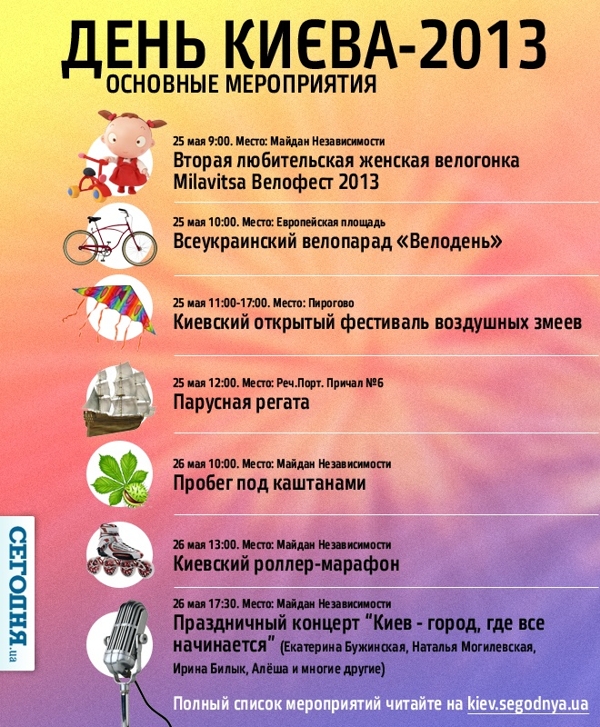 Празднование Дня столицы и Дня Киева в этом году продлится с 23 по 26 мая. В частности, 25 мая на территории историко-архитектурного памятника-музея «Киевская крепость», по адресу: ул. Госпитальная, 24-А, состоится концертная программа с участием духовых оркестров.