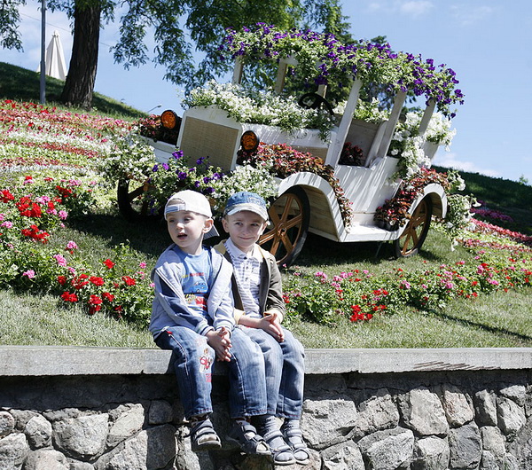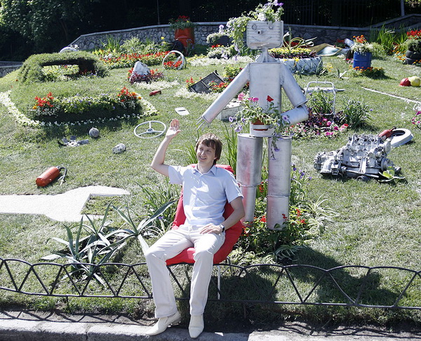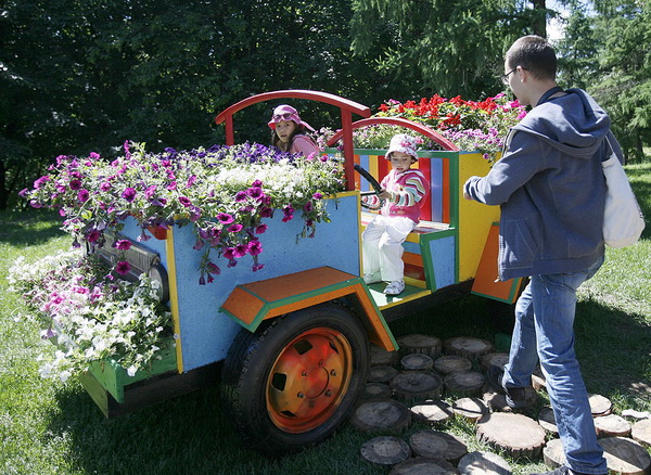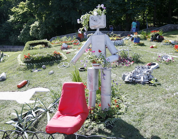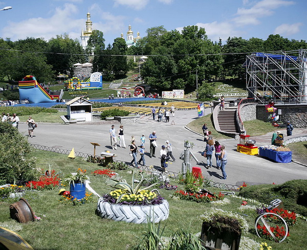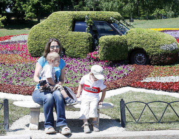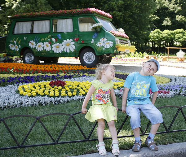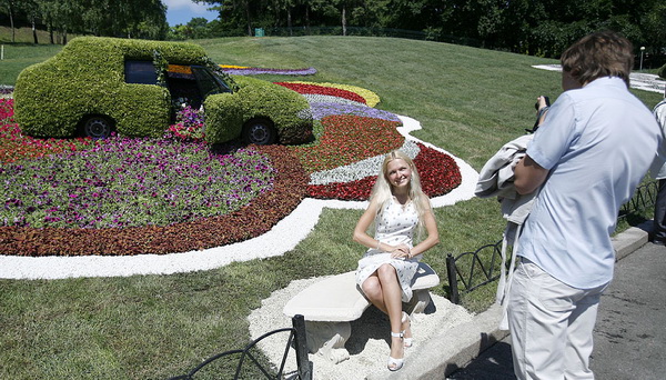 В День Киева на Певческом поле открылась первая «Выставка зеленых авто». Десять уникальных композиций, создали дизайнеры коммунального объединения «Киевзеленстрой» дополнили аллею цветочными автозапчастями.