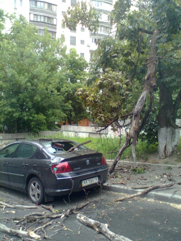 В Соломенском районе Киева на ул. Островского шквальными порывами ветра повалило дерево, которое разбило легковой автомобиль Peugeot 407. ЧП произошло сегодня, 26 мая, приблизительно в 17:30.